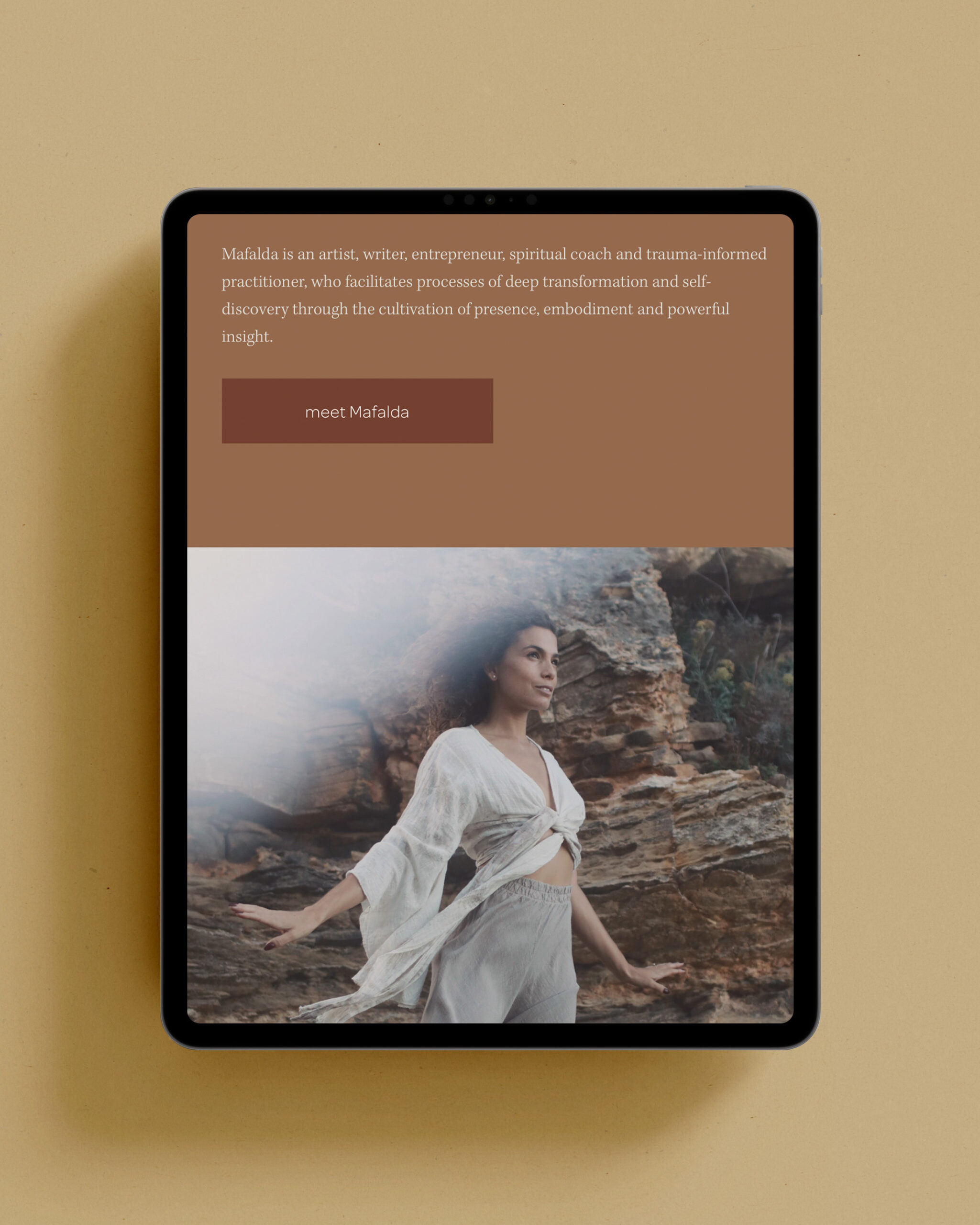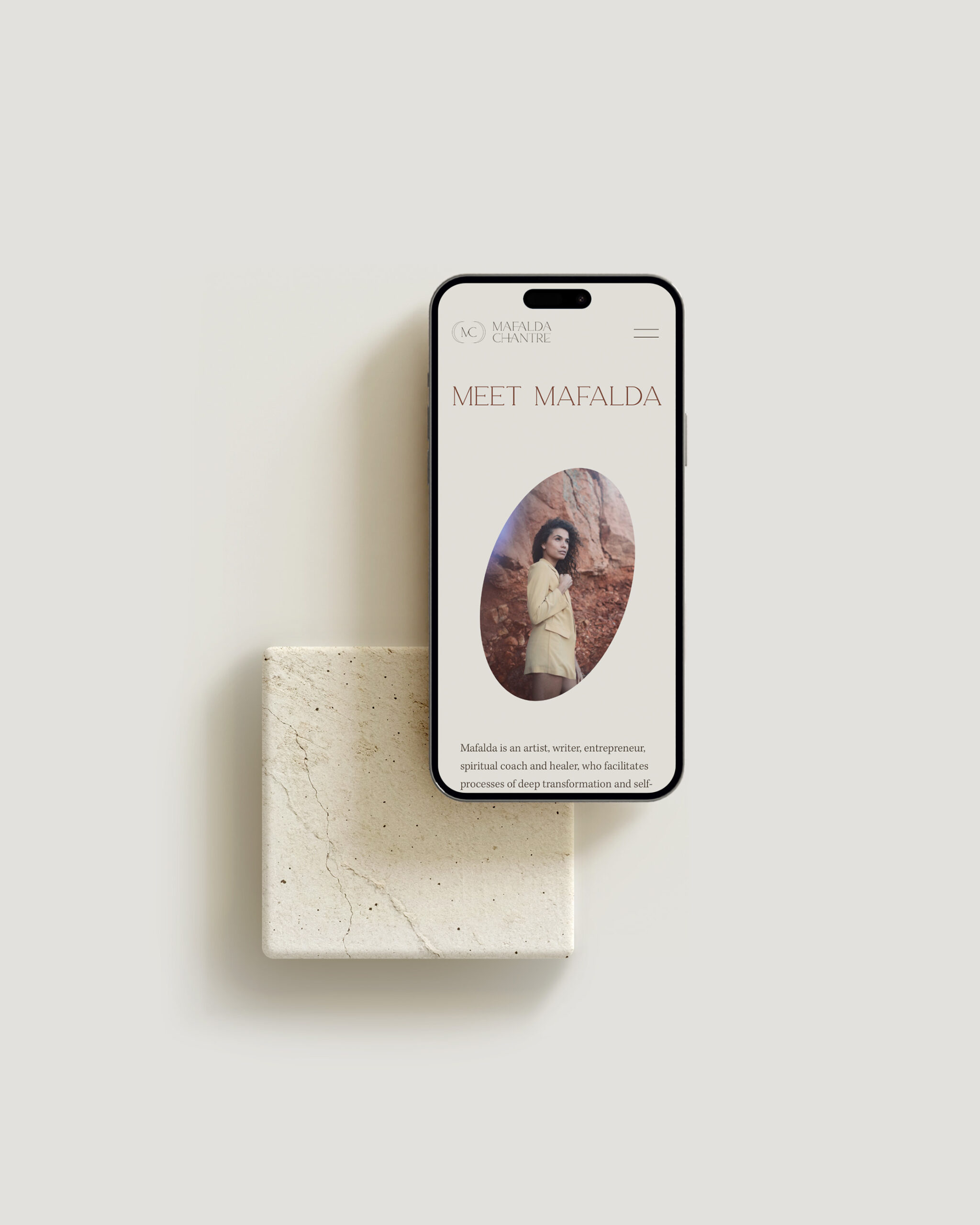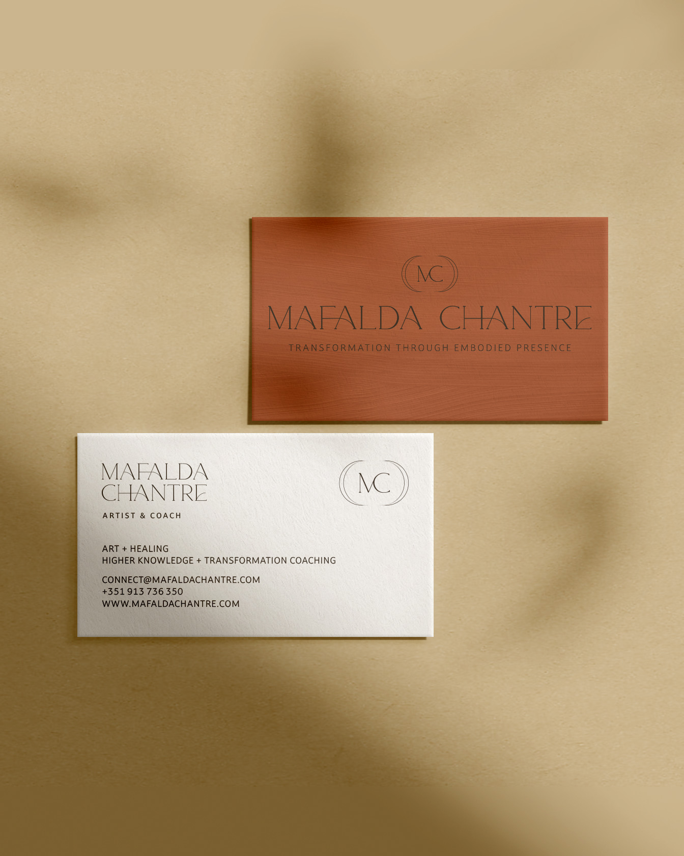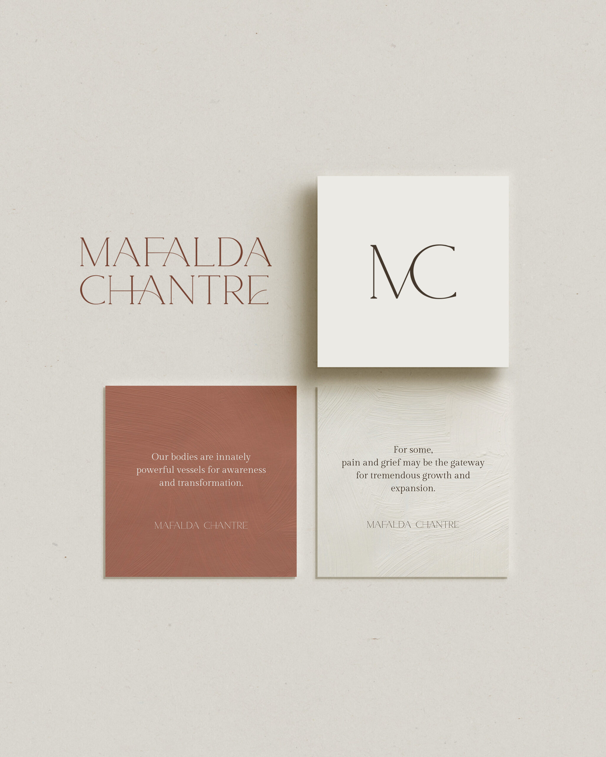The visual identity draws deeply from the symbolism of clay, embodying transformation and creation at its core. The earthy yet warm color palette, inspired by the natural hues of clay, reflects the grounded and nurturing essence of Mafalda's work. Clay serves as a powerful metaphor: just as it is harvested, shaped, and transformed into something meaningful, so too can trauma be reworked into strength and beauty through deep, intentional processes. The typography, chosen for its gentle and sensitive character, conveys a sense of care, artistry, and compassion—qualities central to her roles as an artist, coach, and healer.